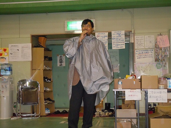 避難所の若林体育館にてご挨拶