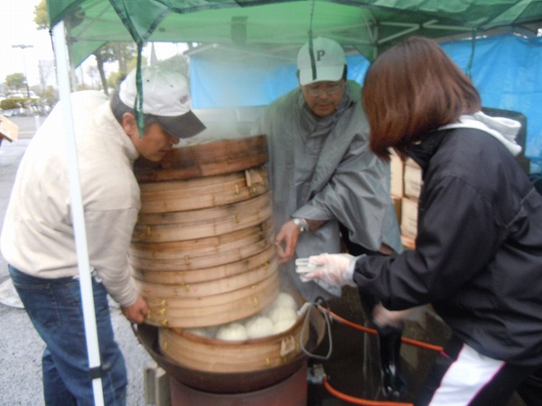 被災者の方々に、あたたかくて美味しいもので少しでも喜んで元気を出していただければ...。そんな思いで、一週間前から肉まんを求めて横浜の中華街を回ったところ、雅秀殿(がしゅうでん)という肉まん屋さんが大変協力的で、美味しくて評判です。そこの肉まんに決めました。機材はそのお店から貸していただきました。